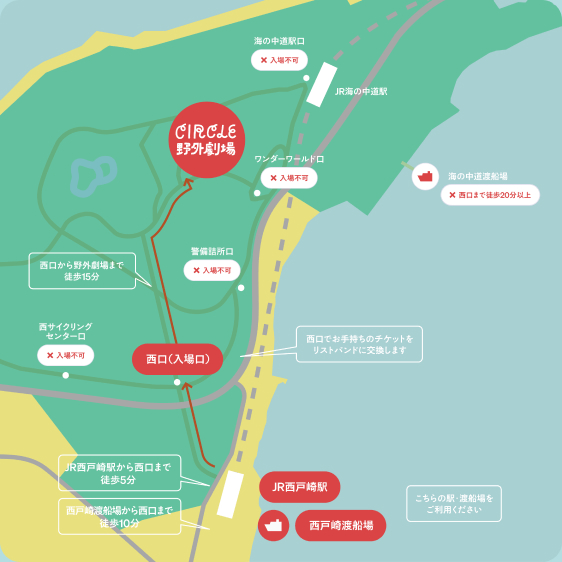 海の中道海浜公園への入口は「西口」のみとなります。ご注意下さい。「海の中道駅口」「ワンダーワールド口」からのご入場はできません。