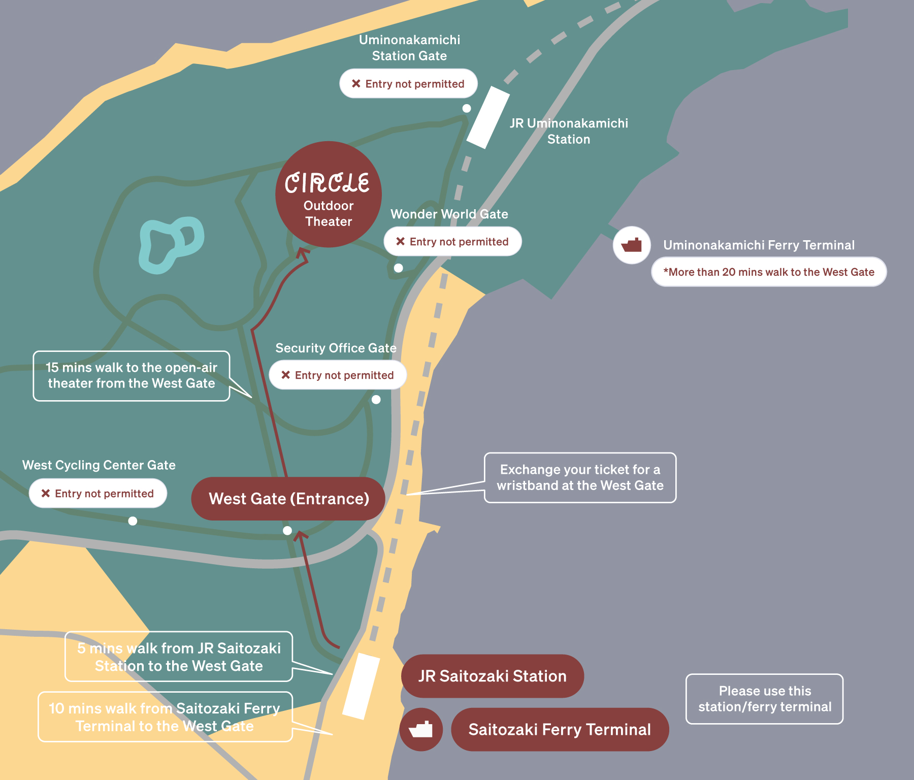 *It takes more than 20 mins by foot from the Uminonakamichi Ferry Terminal to the West Gate. Please use the ferry arriving at the Saitozaki Ferry Terminal.