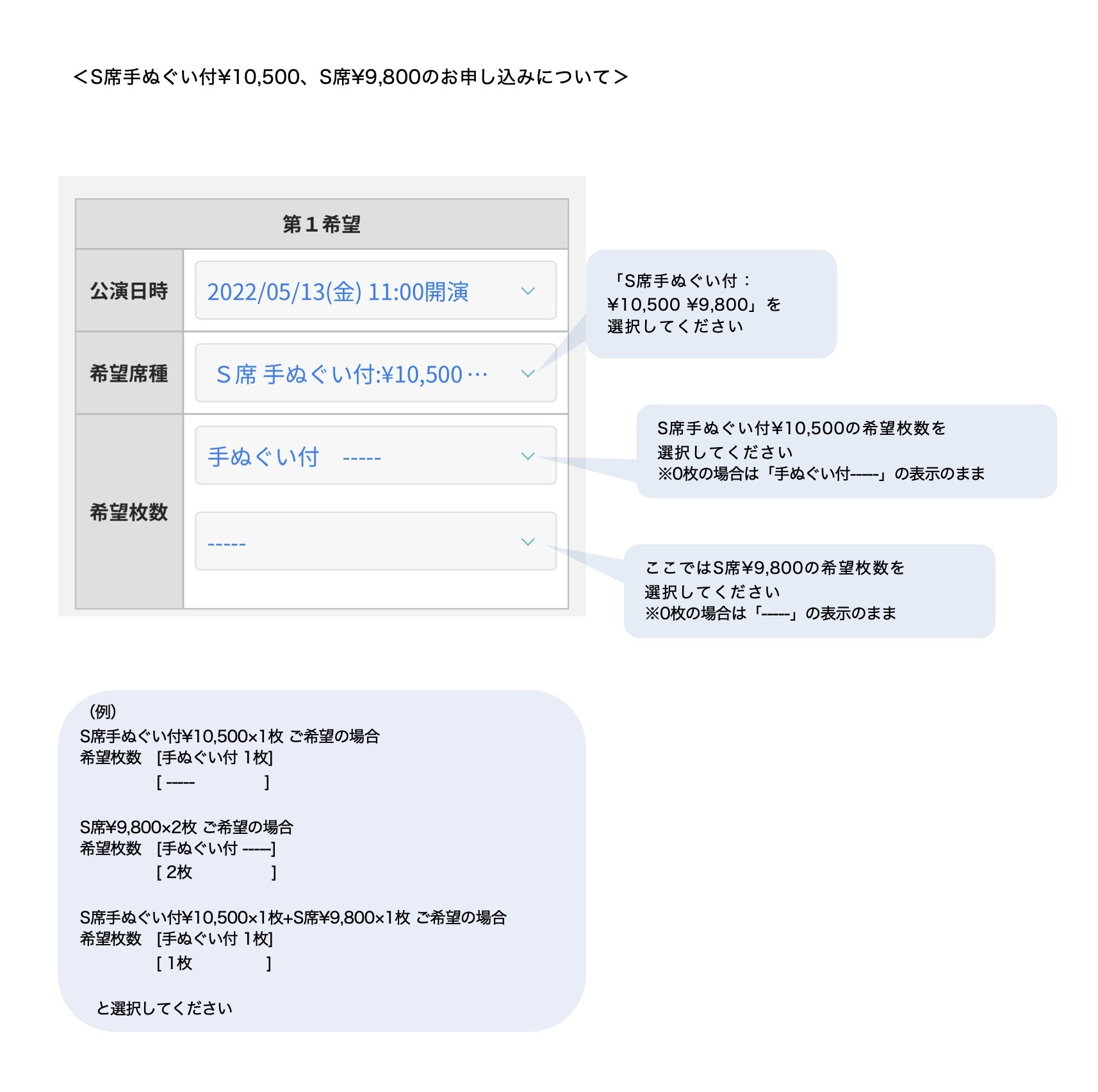 「S席(手ぬぐい付)¥10,500」「S席¥9,800」をご希望の方は下記(1)をご参考にお申し込みをお願いします。また「S席(手ぬぐい付)¥10,500」と「S席¥9,800」で複数枚同時にお申し込みいただいたチケットも、ご当選の場合、連続したお座席でご準備いたします。※場合によっては前後になる可能性もございます、予めご了承ください。